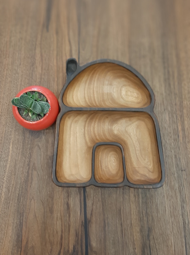 ظرف سرو دستساز طرح کلبه که از چوب ملچ با دقت و ظرافت خاصی ساخته شده با داشتن ۳ خانه مناسب سرو تنقلات و شکلات است.با بهترین نوع روغن گیاهی مخصوص ظروف چوبی پوشش و آبگریز شده است. دارای ضمانت