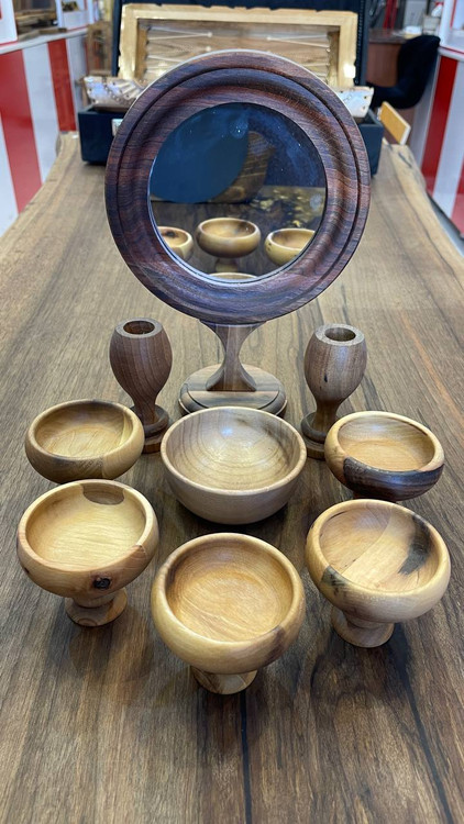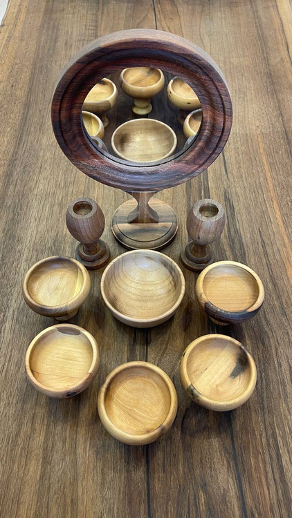 هفت سین چوبی ساخته شده از چوب گردو دارای ۵ کاسه ۷ سانتی پایه دار و یک کاسه ۱۰ سانتی بدون پایه و آیینه و دوتا جا شمعی است. که میتونید هر آیتمیش رو حذف یا هر آیتم دیگه خواستید بهش اضافه کنید، بسیار زیبا و ماندگار